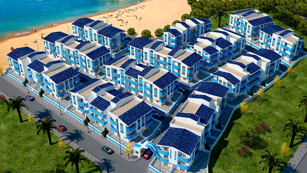 مؤلف من 167 شاليه – يتميز بإطلالة بحرية لمعظم الشاليهات إضافة الى وجود مكسر صخري مميز امام المجمع.